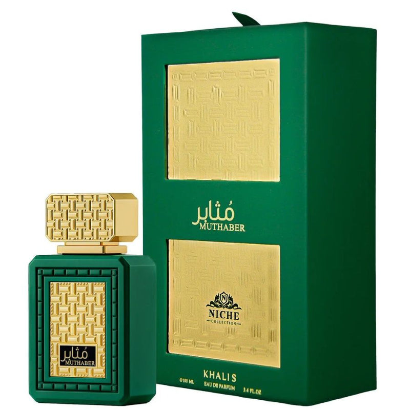 “Muthaber Niche” by Khalis Eau de Parfum is a warm, modern amber-woody composition that balances cool spice with creamy woods for an inviting, everyday-signature feel.