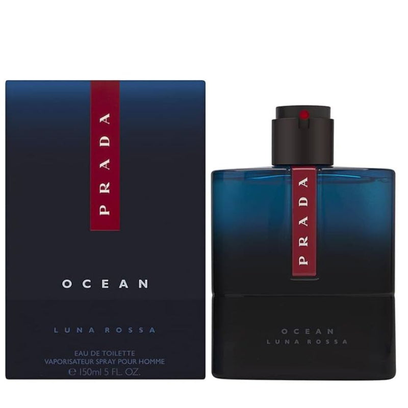 “Luna Rossa Ocean” by Prada Eau de Parfum (Men) — 5.0 oz is a refined fresh-warm take on the Luna Rossa universe, spotlighting grapefruit brightness over incense and a smooth vanilla bean trail.