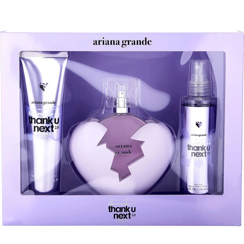 “Thank U Next 2.0” by Ariana Grande — Eau de Parfum 3-Piece Gift Set is a bright fruity-floral gourmand wrapped in soft woods and musk—bundle includes full-size EDP plus body spray and body cream for effortless layering.